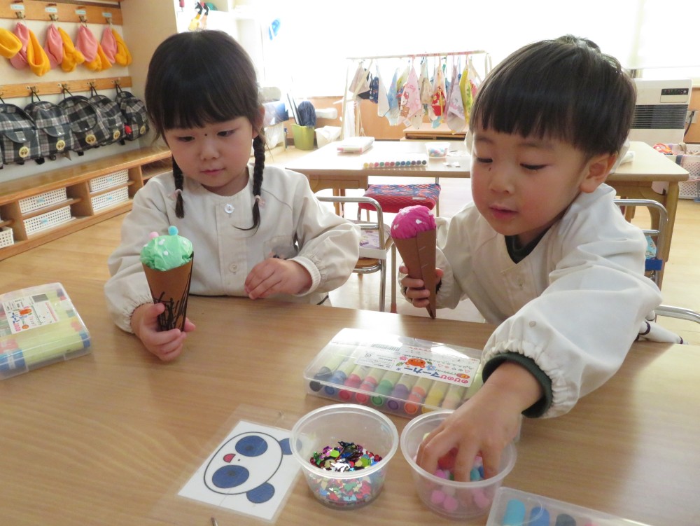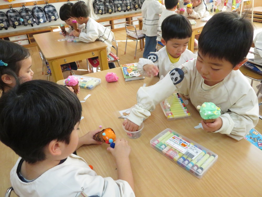 12月2日(火)の「お店屋さんごっこ」に向けてそれぞれクラスで準備を進めています。今回は年少さんの準備の様子を紹介します。年少さんでは、アイスクリームづくりの活動を行い、みんなアイス屋さんになって楽しくアイスをつくっていました。今までつくった品物は、りんご飴とミックスジュース。次回は、ラーメンとサンドイッチをつくる予定です。