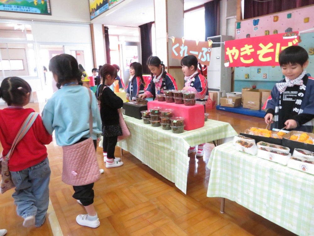 「いらっしゃいませ!!」「いらっしゃいませ!!」と元気な子どもたちのかけ声が飛び交う中「お店屋さんごっこ」がお遊戯室で始まりました。