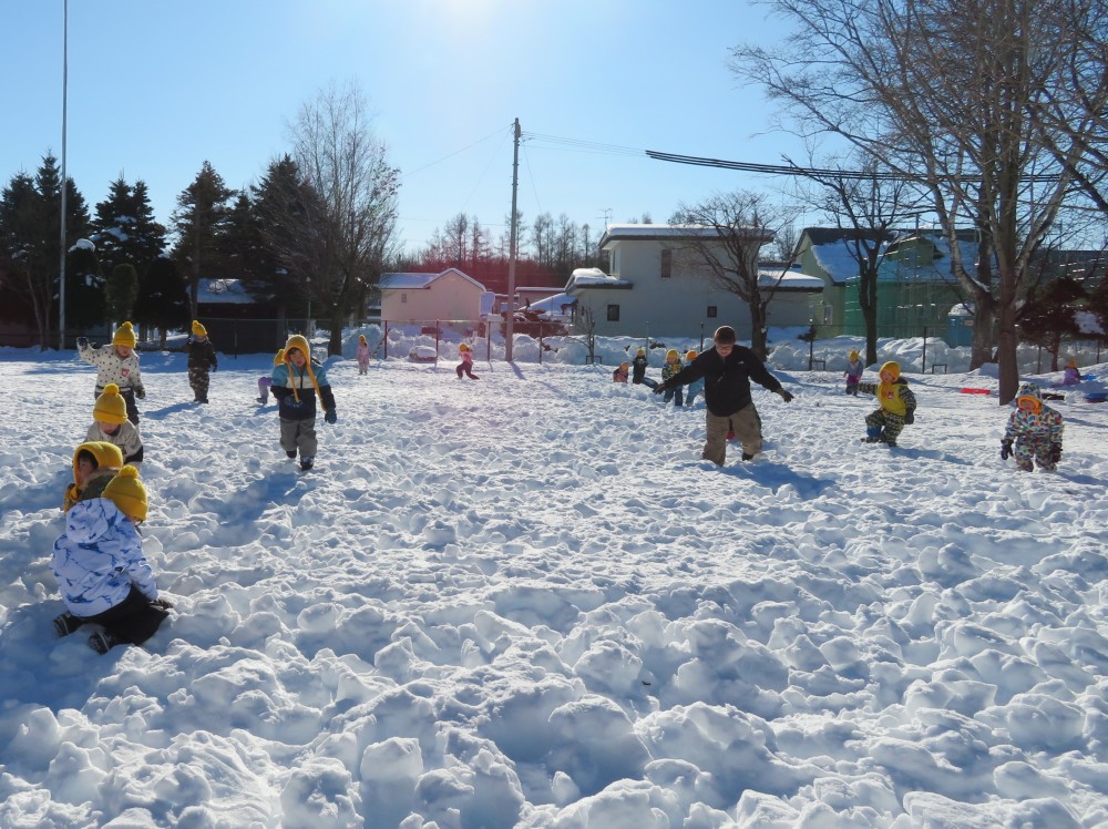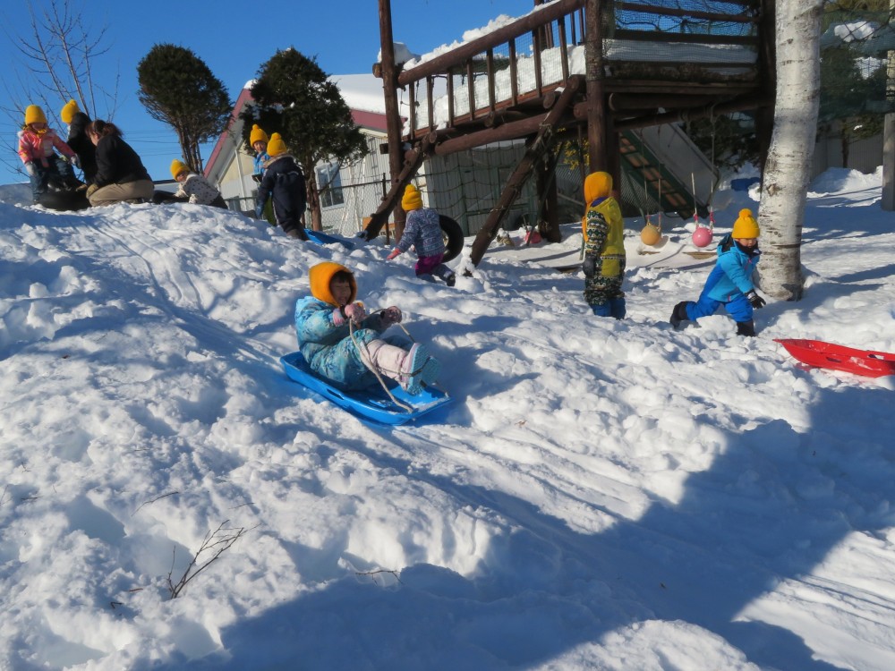 12月17日(水)各学級で外に出て、園庭に積もった雪で思い思いに雪遊びをしました。園庭の雪山に上がってソリ滑りをしたり、雪をかき分けて歩いたりと、良い天気の中、園庭には子どもたちの元気な声が溢れていました。