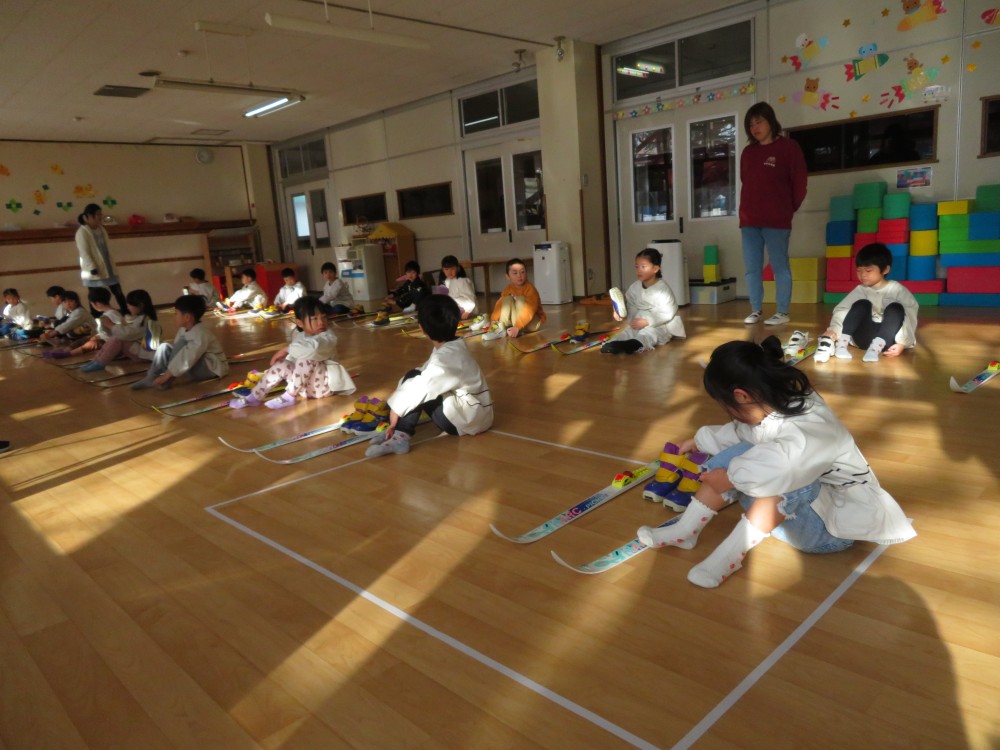 今回、1月23日(金)にスキー靴を履いて、スキー板を付ける練習と転んで起きる練習をしました。