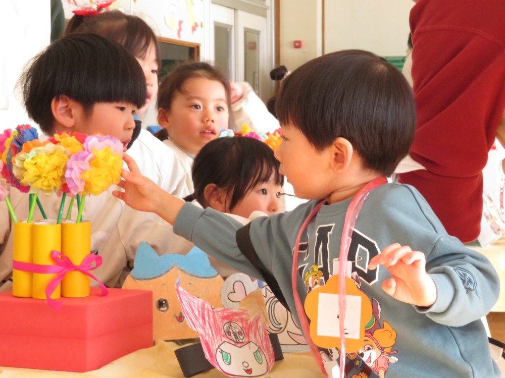一日体験入園に子ども達は、お店屋さんごっこ用のお金で好きな品物をたくさん買って買い物を楽しみました。年少さんたちは、「いらっしゃいませ!!」と元気な声で呼びかけたり、やさしく品物を渡したり、自分たちもお店屋さんごっこを楽しんでいました。
