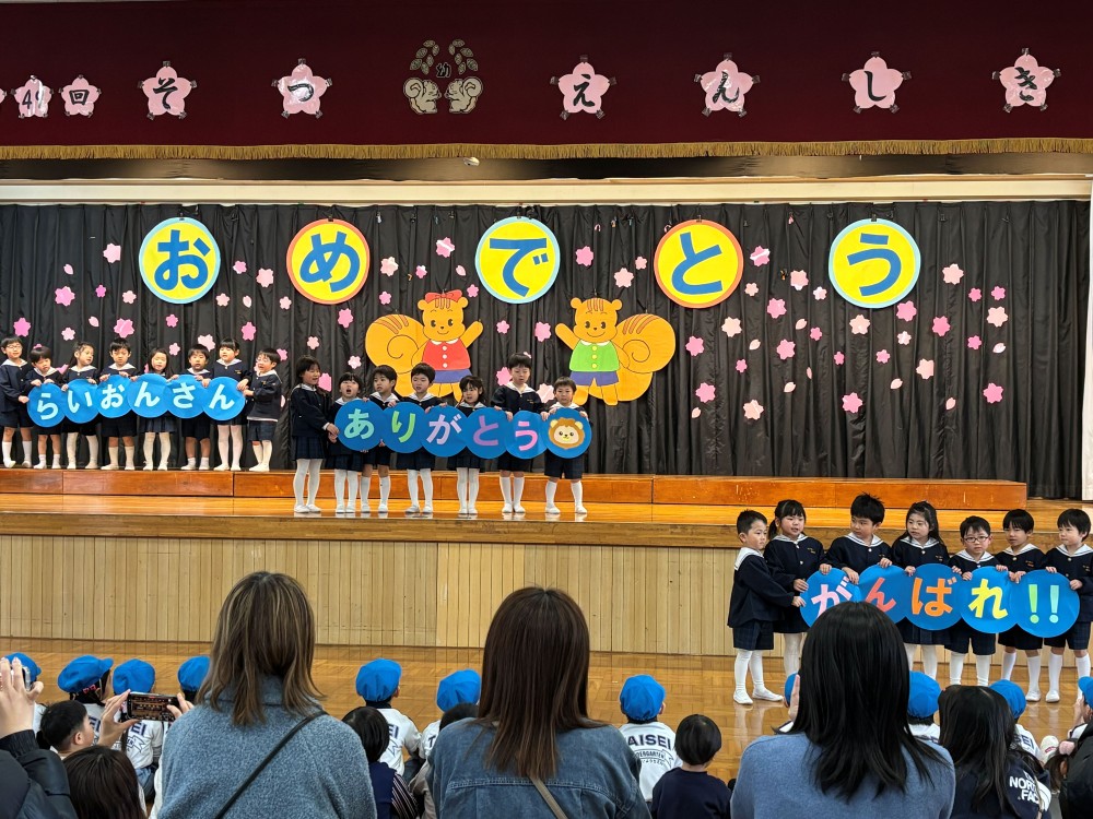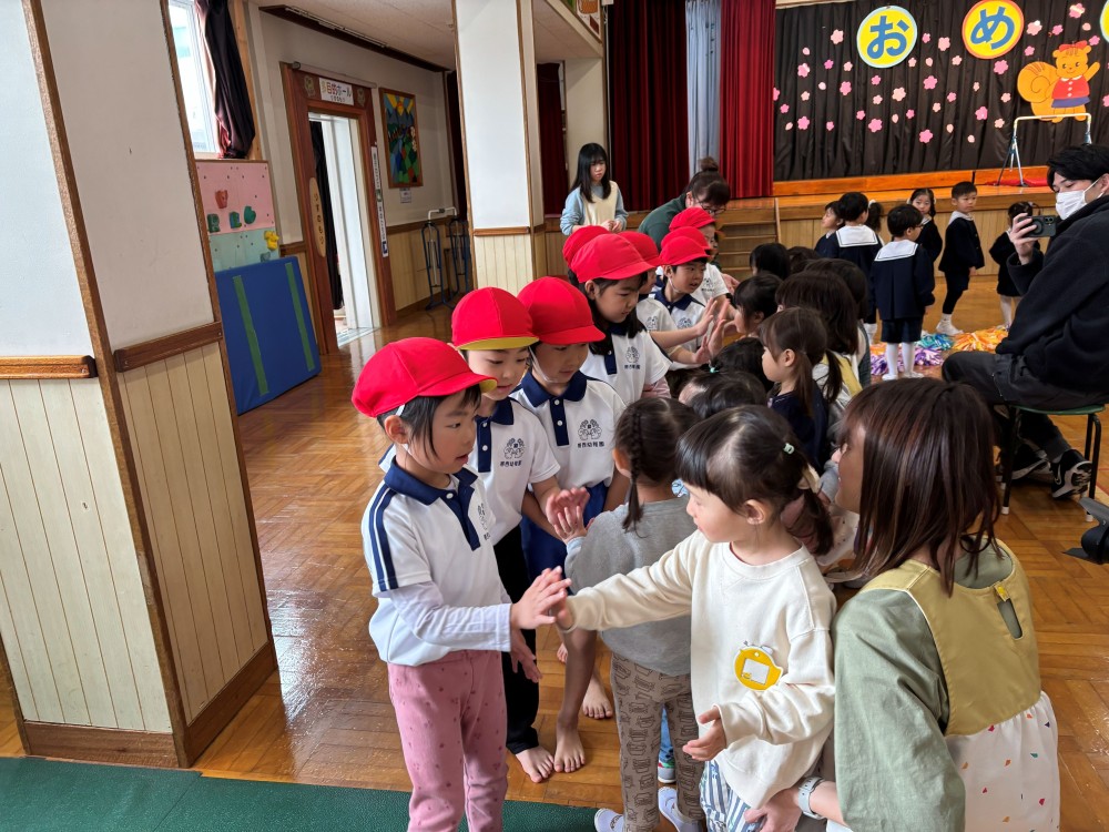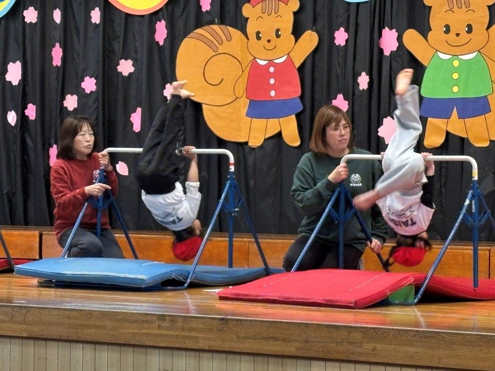 2月27日(金)に「園児お別れ会」がお遊戯室で行われました。年長さんの保護者が見守る中、年中さんがお兄さんお姉さんたちに感謝を込めてダンスを披露し、年長さんは「体育遊び」(柔軟・側転・鉄棒・跳び箱)を堂々と発表し、はつらつとした姿を年中さんに伝えました。
