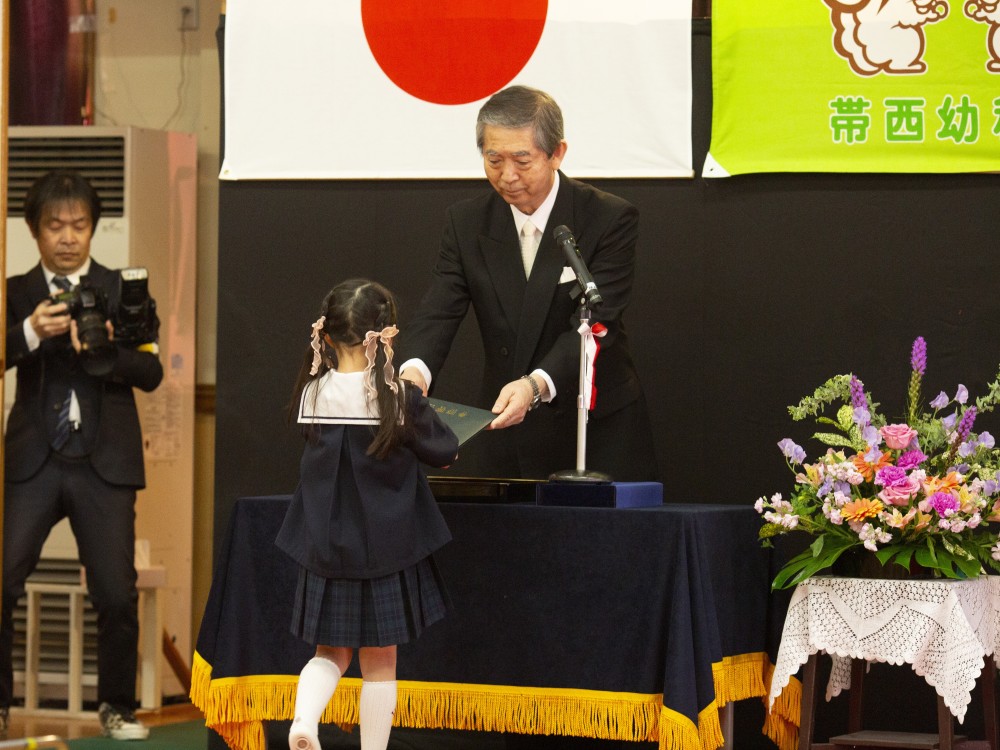 3月14日(土)に第49回帯西幼稚園卒園式が行われ、41名の卒園児が幼稚園を巣立ちました。式では、立派に園長先生から卒園証書をもらい、式の中で歌う3曲のうたも気持ちを込めたきれいな歌声を会場に響かせていました。また、退場時には一人ひとりが将来の夢を元気に語り、会場からは大きな拍手が送られました。小学校へ行っても、「あきらめないで最後までやればできる」という帯西幼稚園で学んだことを忘れずに頑張ってほしいと思います。