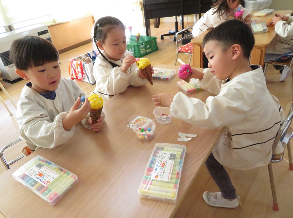 12月2日(火)の「お店屋さんごっこ」に向けてそれぞれクラスで準備を進めています。今回は年少さんの準備の様子を紹介します。年少さんでは、アイスクリームづくりの活動を行い、みんなアイス屋さんになって楽しくアイスをつくっていました。今までつくった品物は、りんご飴とミックスジュース。次回は、ラーメンとサンドイッチをつくる予定です。
