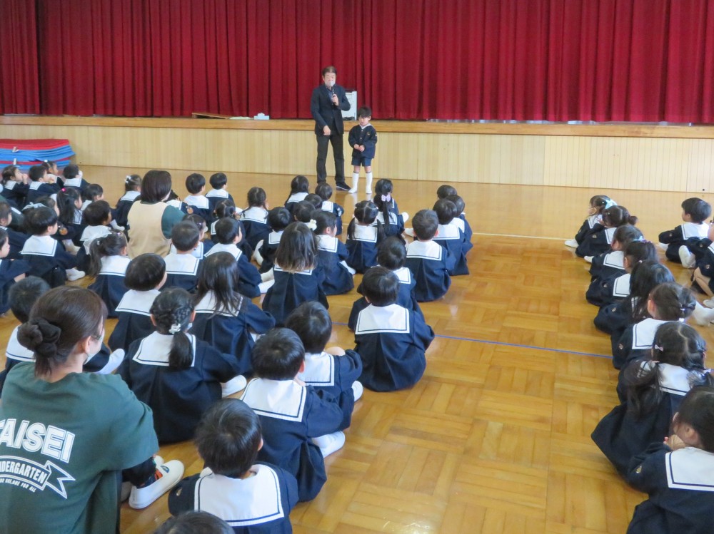 園長先生と3つのお約束をしました。①早寝早起きをする。②お家のお手伝いをする。③お客さんが来た時や親せきの家などに出かけた時には元気に挨拶をするの3つです。