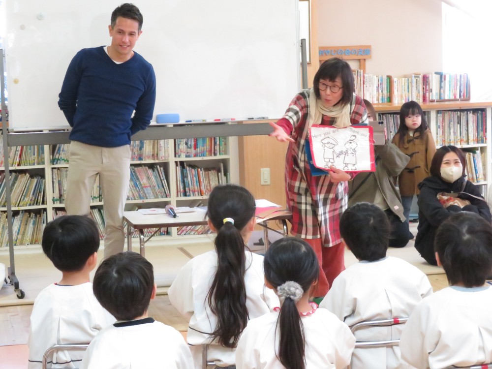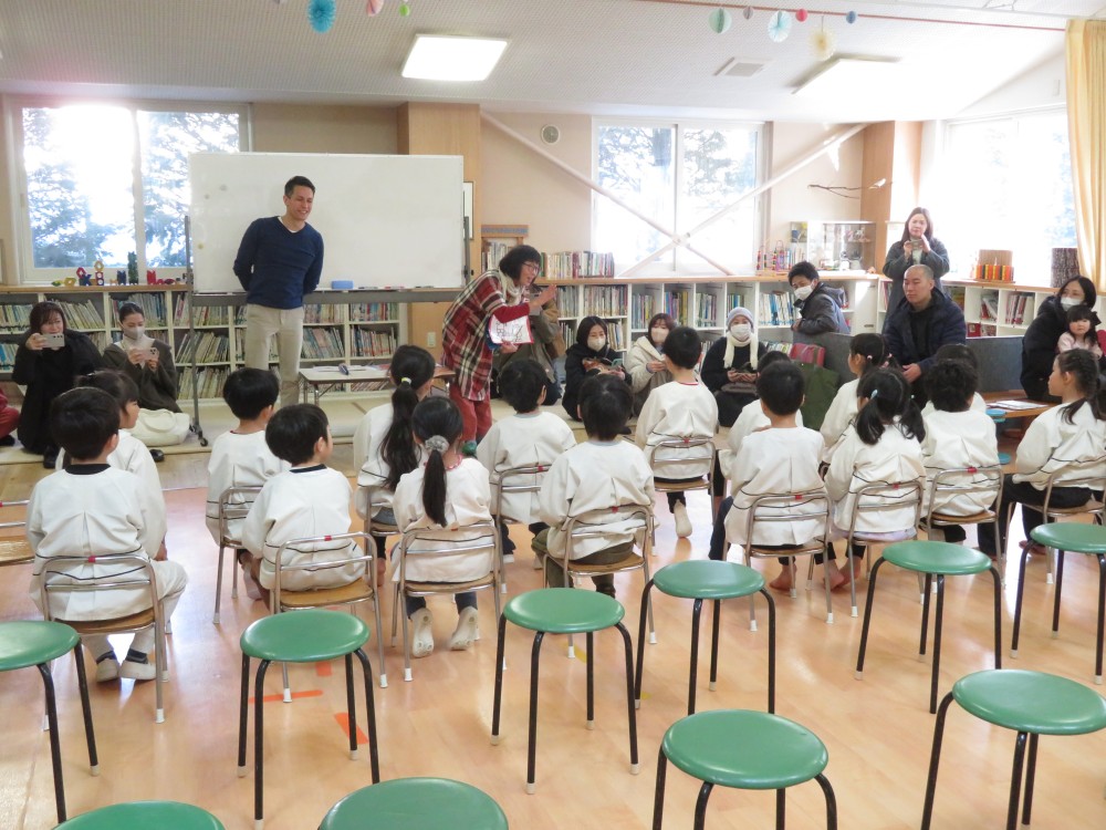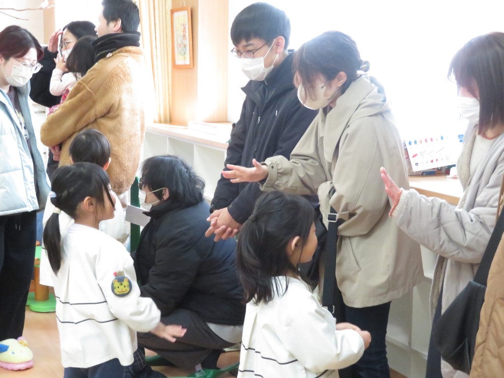 3学期の年長さんの参観日が2月18日(水)に行われました。今回は、リスの森の教室で「年長イングリッシュデイ」の子どもたちの様子などを保護者の方に観ていただきました。 子どもたちは、外国人講師のヴィック先生と浦島先生と簡単な会話をしたり、子どもたちからお父さん、お母さんに好きな果物を英語で聞いてじゃんけんをするゲームなどをしながら英語を楽しく学んでいました。