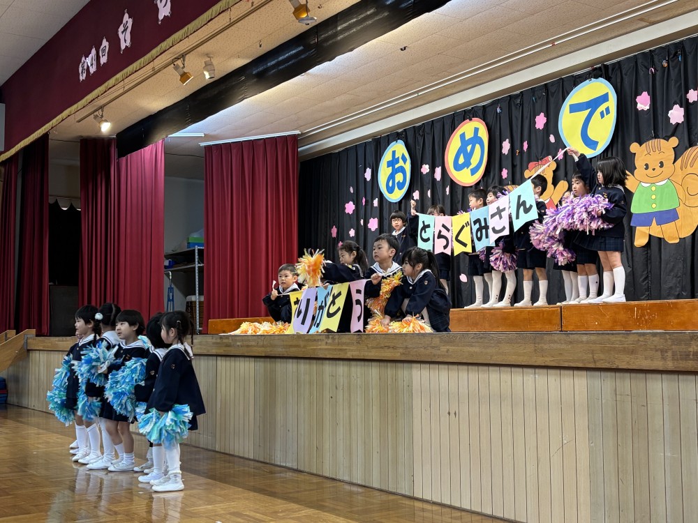 2月27日(金)に「園児お別れ会」がお遊戯室で行われました。年長さんの保護者が見守る中、年中さんがお兄さんお姉さんたちに感謝を込めてダンスを披露し、年長さんは「体育遊び」(柔軟・側転・鉄棒・跳び箱)を堂々と発表し、はつらつとした姿を年中さんに伝えました。